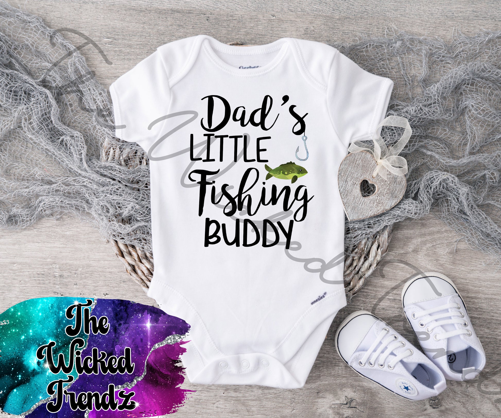 This baby onesie reads: Dad's little fishing buddy.