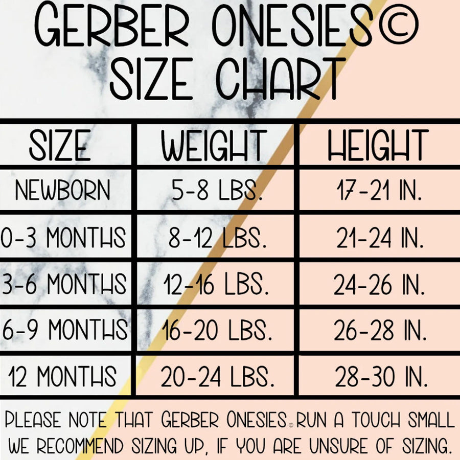 ** Please note that we use Gerber Onesies©. They tend to run a touch small, so if you are hesitating on a size, please purchase the next size up.